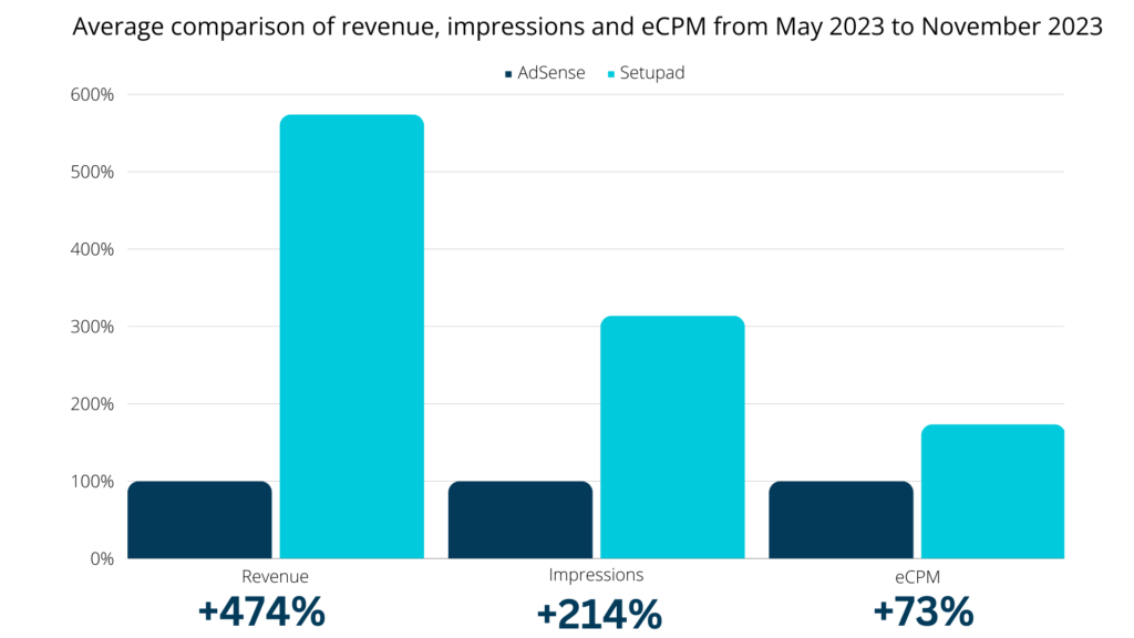 Para calcular el aumento de ingresos, impresiones y eCPM extrajimos los datos de AdSense para compararlos con los de Setupad en el periodo comprendido entre mayo de 2023 y noviembre de 2023, cuando las dos plataformas funcionaban al mismo tiempo en el sitio web. Al dividir los datos de dos fuentes, pudimos observar los siguientes resultados destacados: