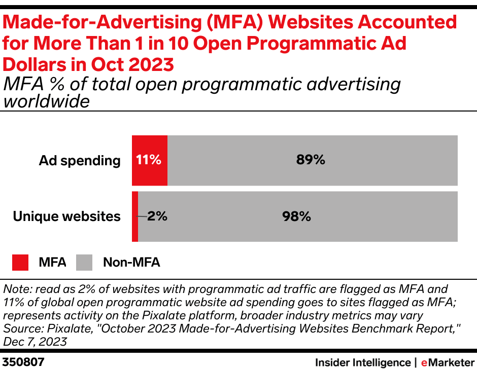 Made-for-advertising (MFA) websites represent only 2% of unique websites globally. However, they command a significant 11% of total open programmatic ad spend, according to data from Pixalate in October 2023.