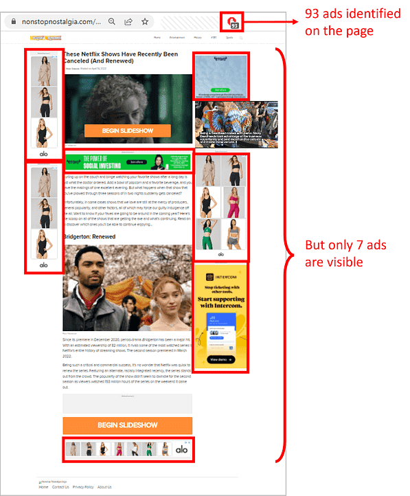 Many MFA sites also display ads that aren’t visible to the human eye. This can be due to ad stacking and pixel stuffing, or other similar techniques that constitute ad fraud.