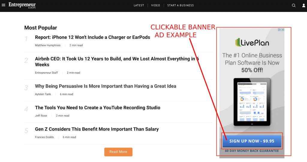 - Content recommendation ads appear as a recommended content on the publisher’s website (supplied by content discovery platforms like Outbrain and Taboola).
