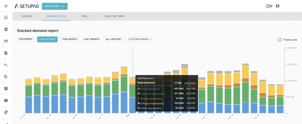 - Stacked reporting of primary demand sources – Prebid, GoogleAdx, OpenBidding, Google Adsense, Amazon TAM, GAM programmatic direct and direct standard/price-priority campaigns.