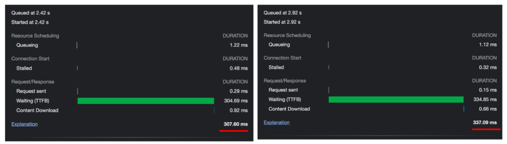 Now, let’s look at the regular HTML banners on a regular page. In this case, the client had two 336×336 square mobile banners. The overall time it took for the ad to download was 307.60ms for the first banner and 337.09ms for the second banner.