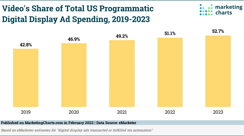 Using advertisements is another lucrative monetization option for video websites. In 2022, video accounted for 51.1% of the whole programmatic digital display ad spending in the US.