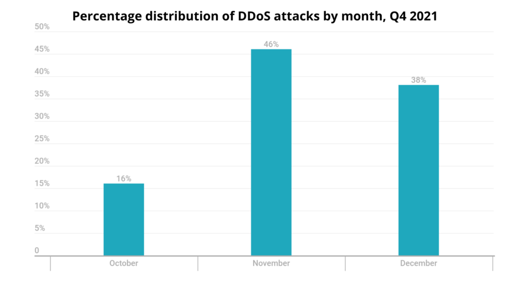 According to data, the highest amount of DDoS attacks occurred in Q4 of 2021, and 46% of these attacks happened during November.