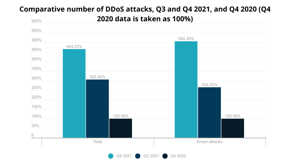 In the graph below you can see that the largest percentage of total DDoS attacks have occurred during Q4 of 2021, and have increased by more than 52% compared to Q3 of 2021.