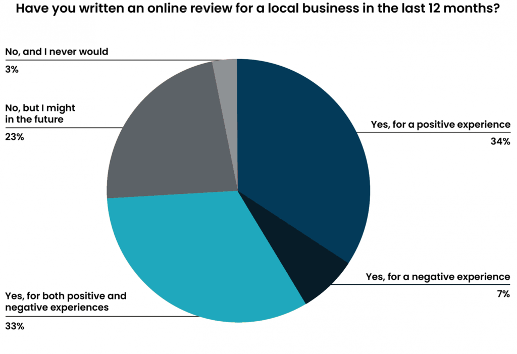 The study showed that 74% of respondents leave reviews–34% only for positive experiences, whereas 7% only for negative experiences and 33% for both.