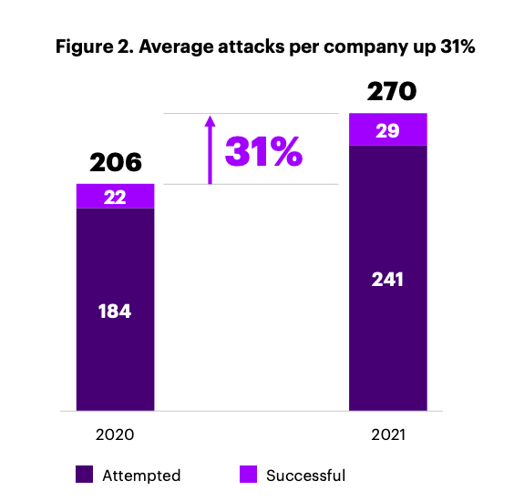 A survey by Accenture shows that in 2021, attacks per company worldwide increased by 31%.