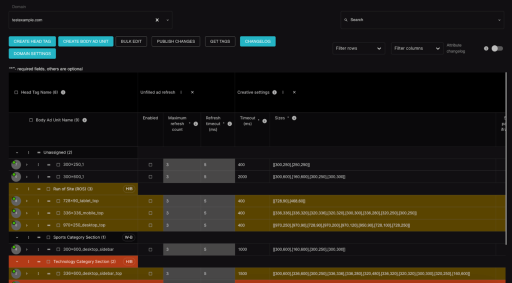 Setupad’s Self-Serve solution has a built-in module for adding or removing SSPs, adjusting ad refresh rates, setting timeouts, and creating new ad units. These features are preset and adjustable without code updates, allowing publishers to tailor their ad experiences to their specific needs.