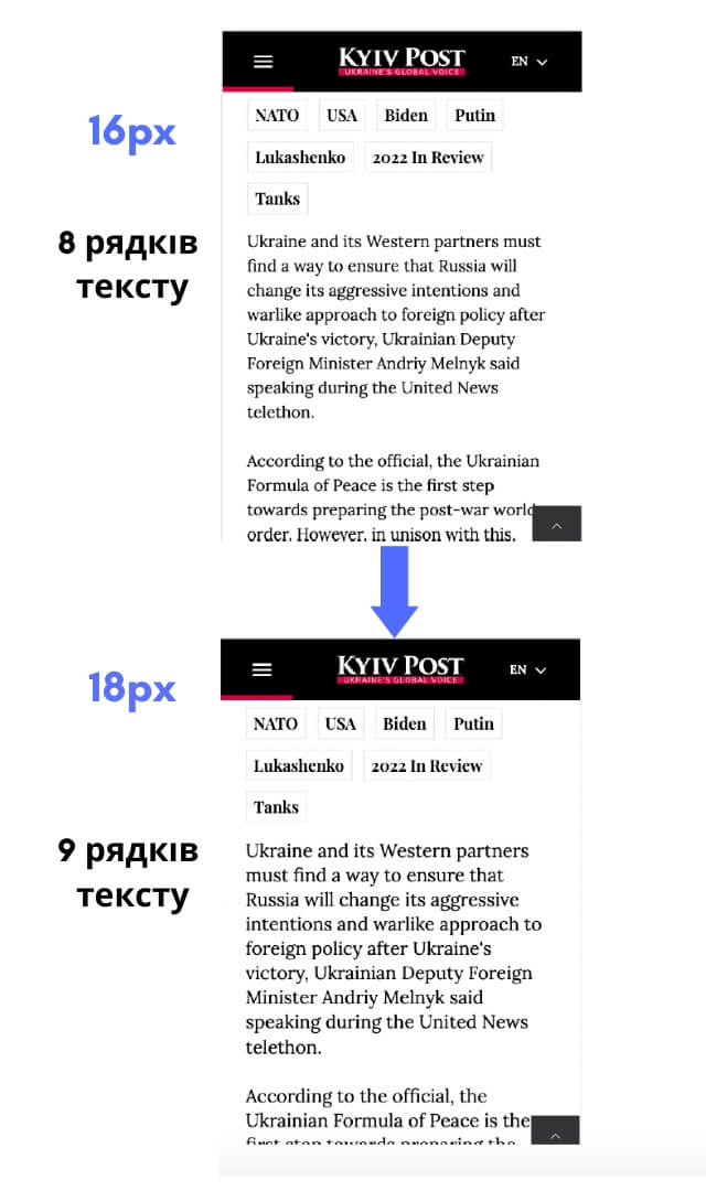 По-друге, ми запропонували усунути проблему скупчення реклами, збільшивши розмір шрифту на мобільній версії сайту. Типографіка — це дуже важлива частина користувацького досвіду, яку часто не беруть до уваги. Ідеальний розмір шрифту не лише робить текст більш розбірливим, але й допомагає передати інформаційну ієрархію та підтримати бренд видавця.