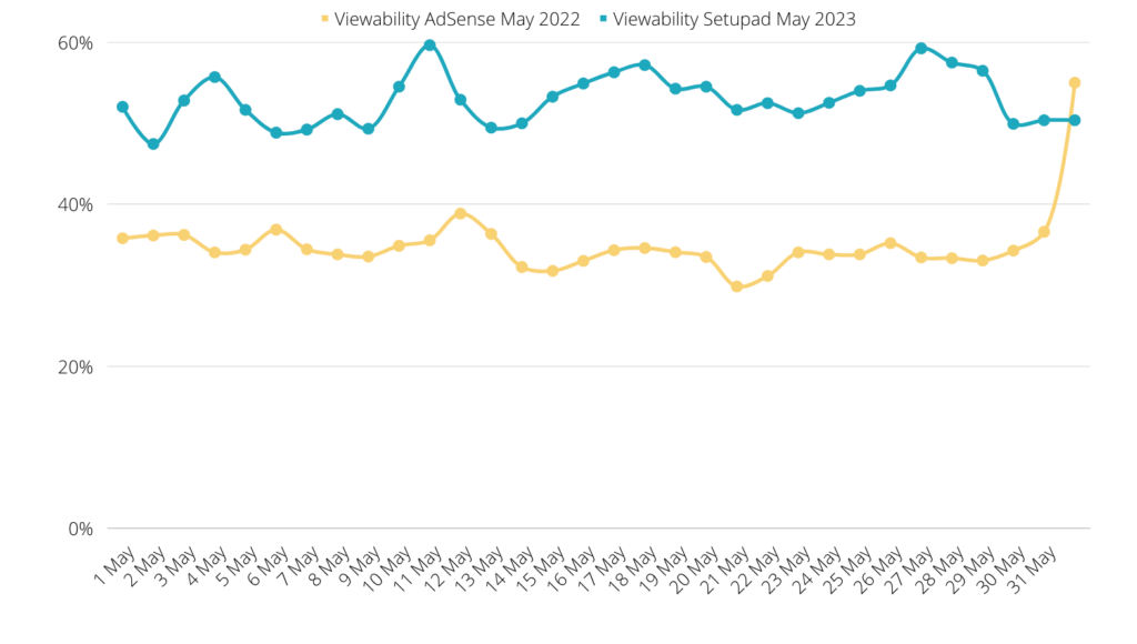 Клієнт також із задоволенням надав нам звіт за травень 2022 року, коли у нього був Google AdSense, який ми порівняли зі звітом Setupad за травень 2023 року. Дані Setupad були отримані з Менеджера реклами Google видавця і включають середній відсоток переглянутих показів на рекламному сервері та унікальних показів Google AdX.
