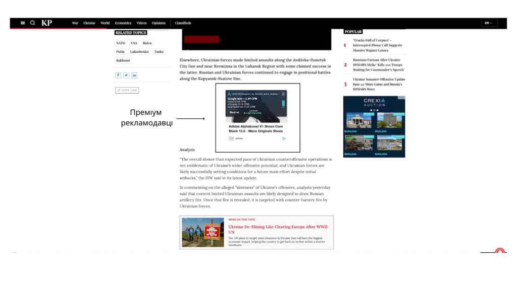 Тому було рекомендовано додати позицію мобільної реклами відразу після першого абзацу. Згідно з нашими внутрішніми даними, це найефективніша рекламна позиція, яка приносить до 20-30% загального доходу від реклами для більшості видавців новин.