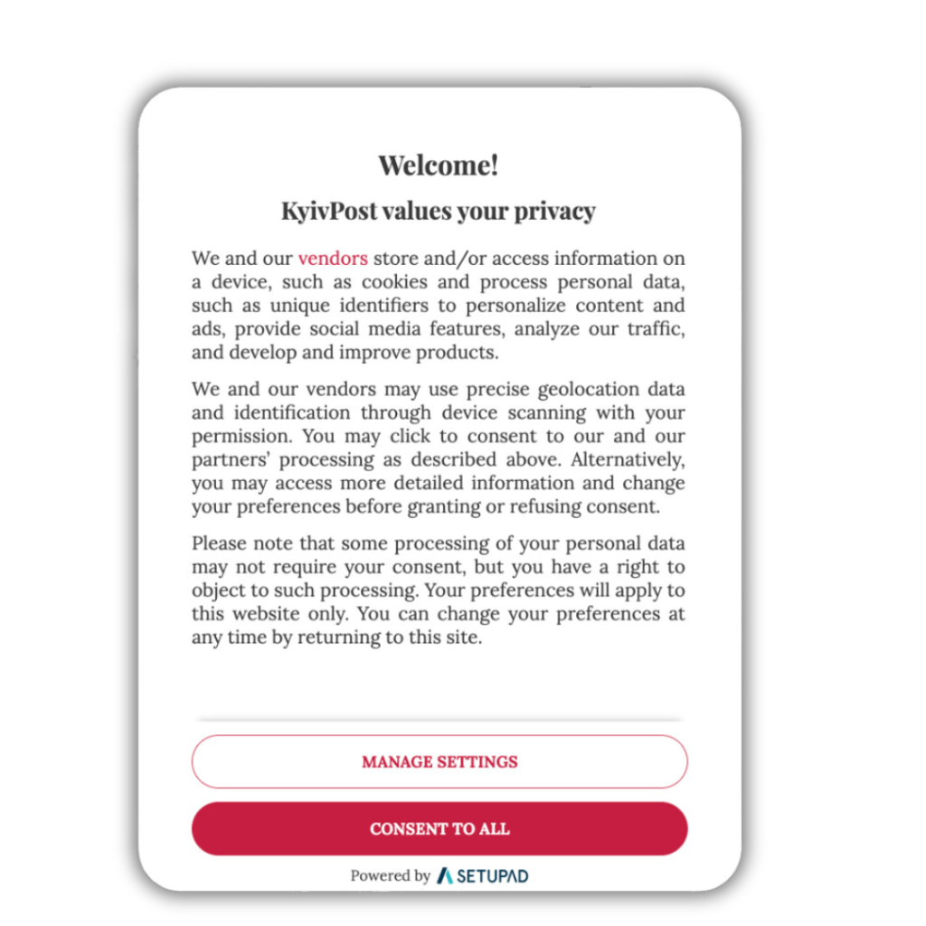 Оскільки трафік видавця здебільшого надходить з країн рівня 1 (Tier 1), ми повідомили, наскільки важливо збирати дані відповідно до найкращих практик конфіденційності. Оскільки Setupad CMP схвалений як Google, так і IAB, а Google оголосив, що пізніше цього року вимагатиме від рекламодавців Google AdSense, Ad Manager та AdMob, використовувати лише сертифікований Google CMP, ми запропонували видавцям інтегрувати наше рішення. Наша команда змінила дизайн CMP, щоб максимально наблизити його до макету видавця.